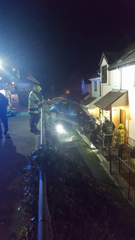 ’On arrival the crews confirmed that the car had left the road and crashed into railings at the front of the property and was resting approximately 10 feet above the ground between the road and the house.