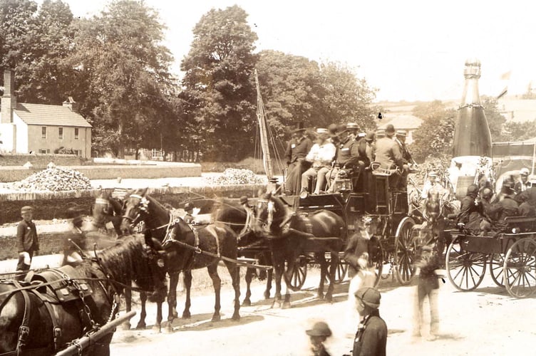 Coach and four, other horse drawn vehicles in a carnival procession, Quay, Kingsbridge. A float with a huge champagne bottle. Possibly Jubilee celebrations of 1897. (Kingsbridge Cookworthy Museum)