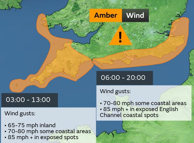 “These include amber warning for winds for southwestern parts of England and Wales Thursday early hours and morning and the far south and southeast of England Thursday daytime and early evening.