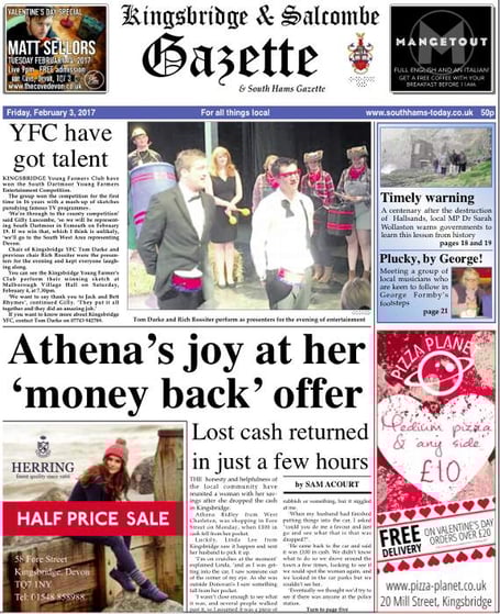 THE honesty of the local community get a large amount of cash back to the owner, Kingsbridge Young Farmers Club succeed in their entertainment competition for the first time, all our coverage of the centenary of the Hallsands disaster and Ukuleles take the South Hams by storm, plus much more inside...