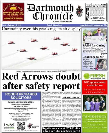 Concern over whether the Red Arrows will be able to put on an aerobatic display at this year’s Port of Dartmouth Royal Regatta.