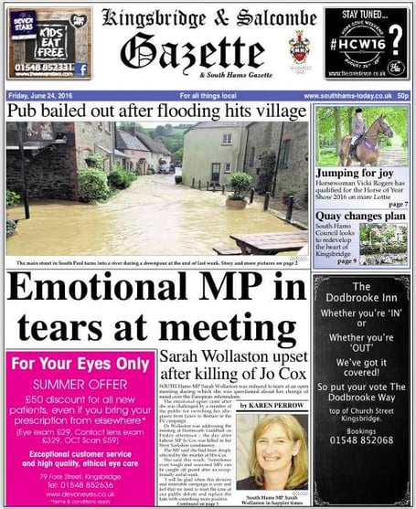 Sarah Wollaston MP attends an open meeting a day after the tragic murder of colleague Jo Cox MP, the Millbrook Inn in South Pool thanks the 100+ people who turned up to help after they were flooded, Vicki Rogers qualifies for the Horse of the Year Show and South Hams Council looks to redevelop the Quay area in Kingsbridge
