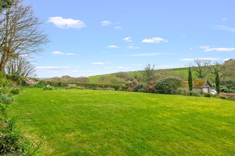 Outside, there is a formal front garden with views over the countryside, and stone steps up to an orchard.